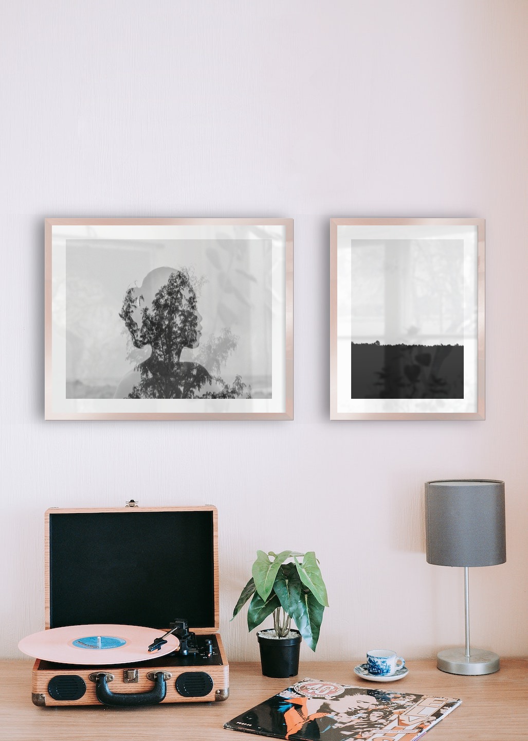 Tavelvägg med ramar i vitt i storlekar 40x50 med posters med "Linje" och "Dimmiga trätoppar från sidan"